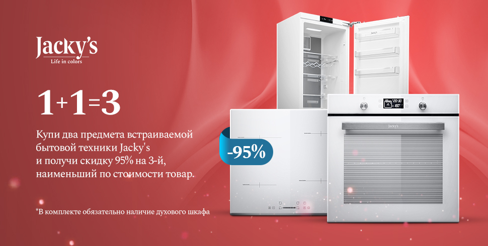 Купи два предмета ВСТРАИВАЕМОЙ бытовой техники Jacky's и получи скидку 95% на 3-й, наименьший по стоимости прибор.